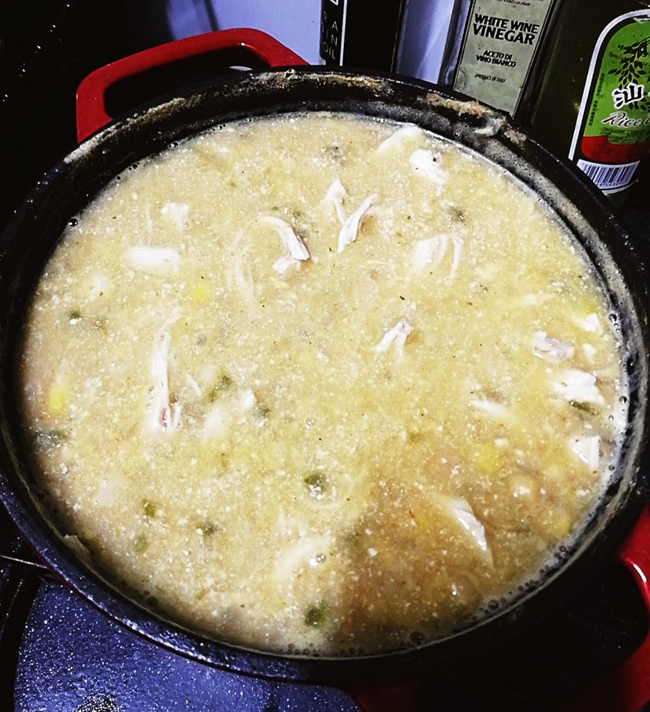 - Add the broth and water. In a small bowl, place 200 grams of the beans, and mash with a fork. Add the mashed, and whole beans to the pot, along with the corn, chillies and chicken. Bring to the boil.