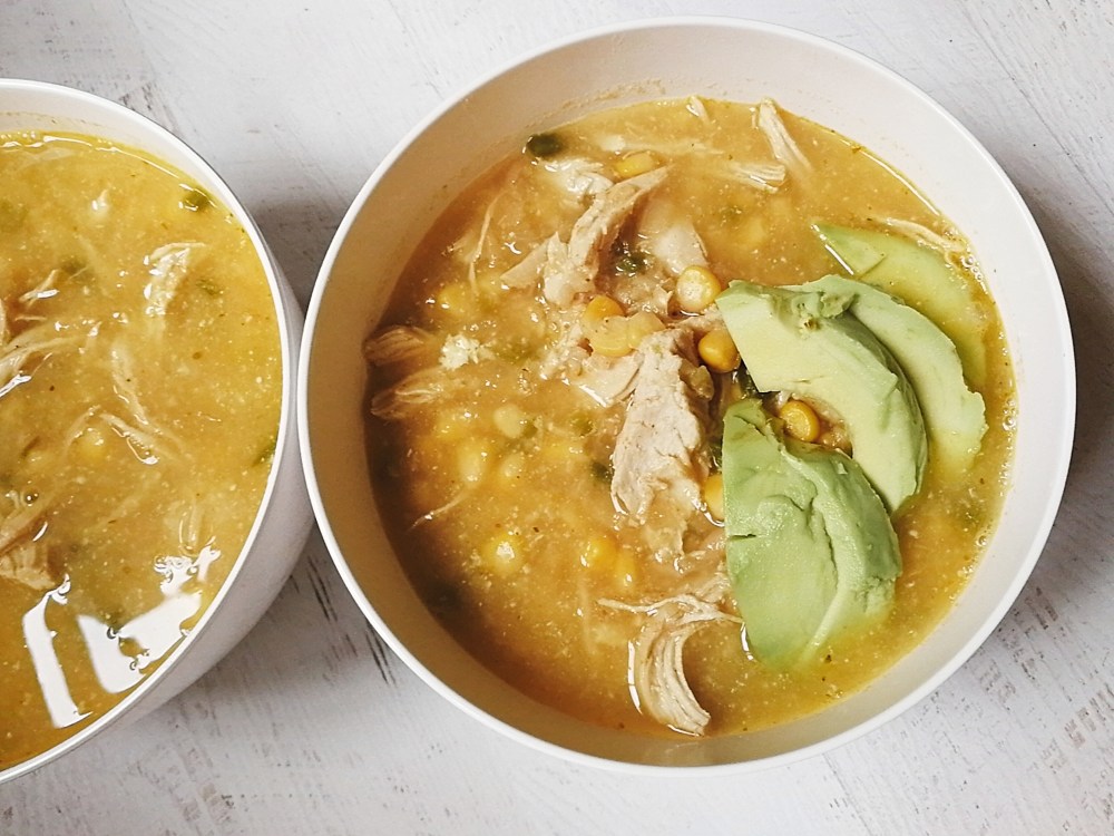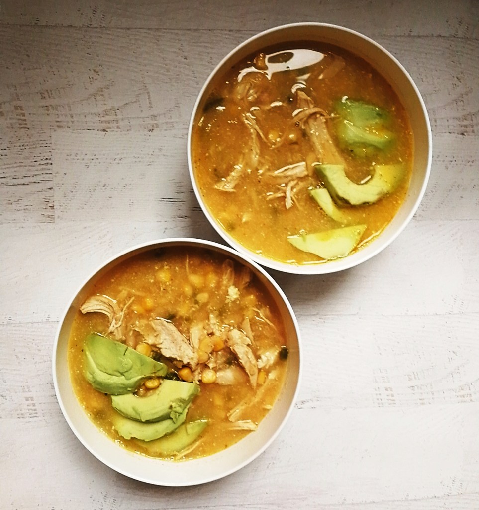 You can also cook this dish in a slow cooker. Just saute the onions and garlic with the spices as described below. Then transfer all ingredients (except Greek yoghurt, lime juice and avocado) to the slow cooker and cook on high for 3 hours, or low for 7 hours. Once done, repeat the same steps below for shredding chicken, adding yoghurt and lime juice and serving.