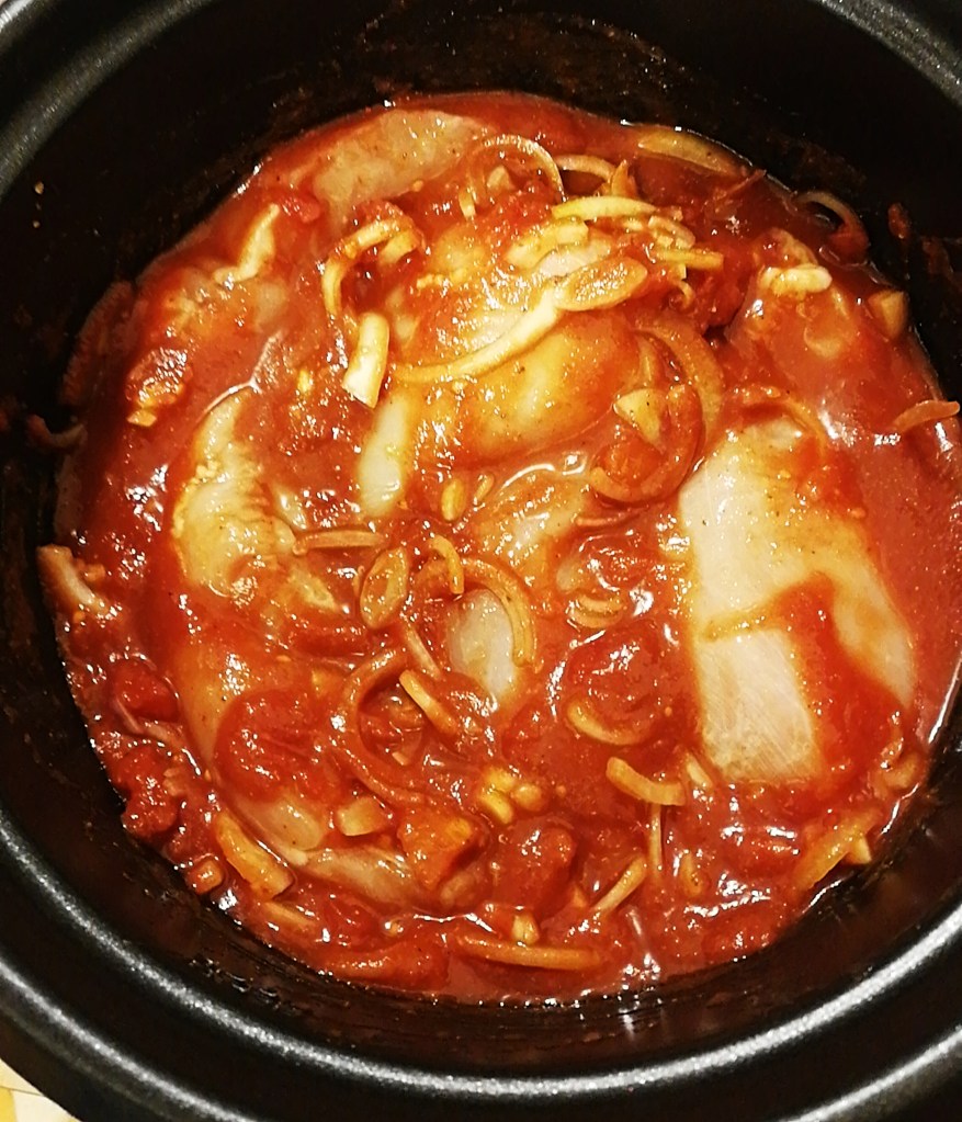 - Combine all ingredients, except the chicken, in the slow cooker. Then place the chicken into the tomato mixture, making sure the meat is fully covered.
