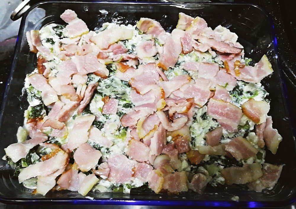 - Add the vegetable and ricotta mix into an oven-safe dish. Sprinkle the bacon over the vegetable mix. Bake for 35 minutes.