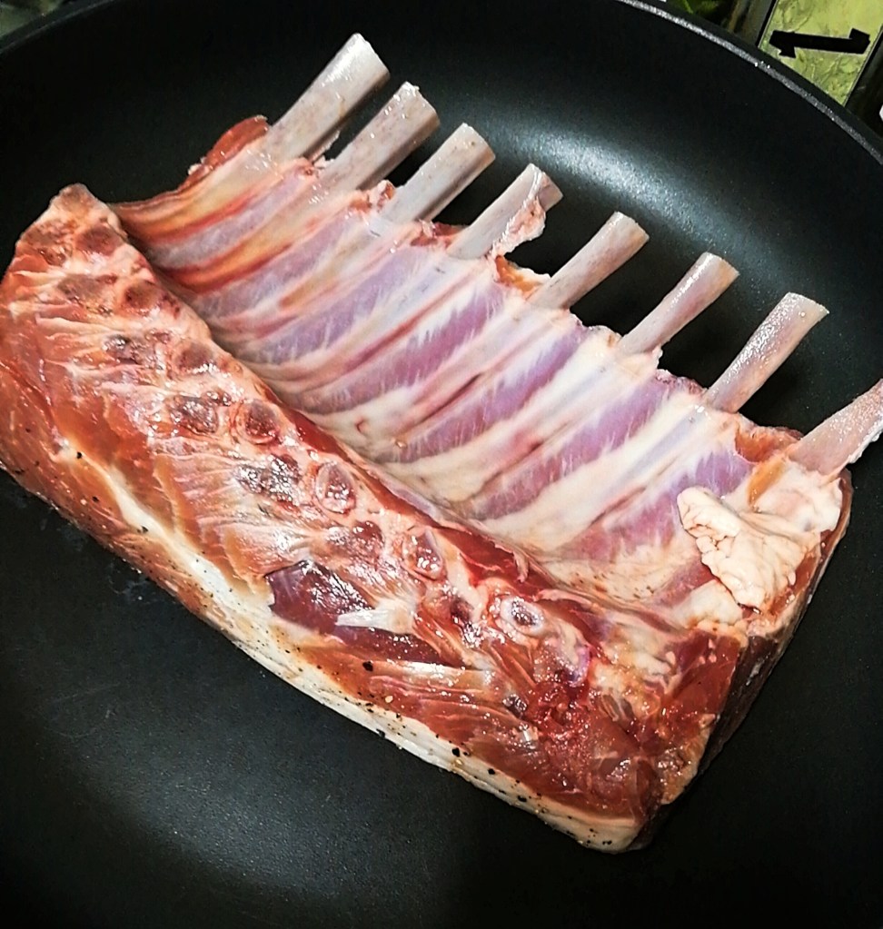 - Score the fat of the lamb rack, season with salt and pepper. Sear on all sides in a large frying pan.