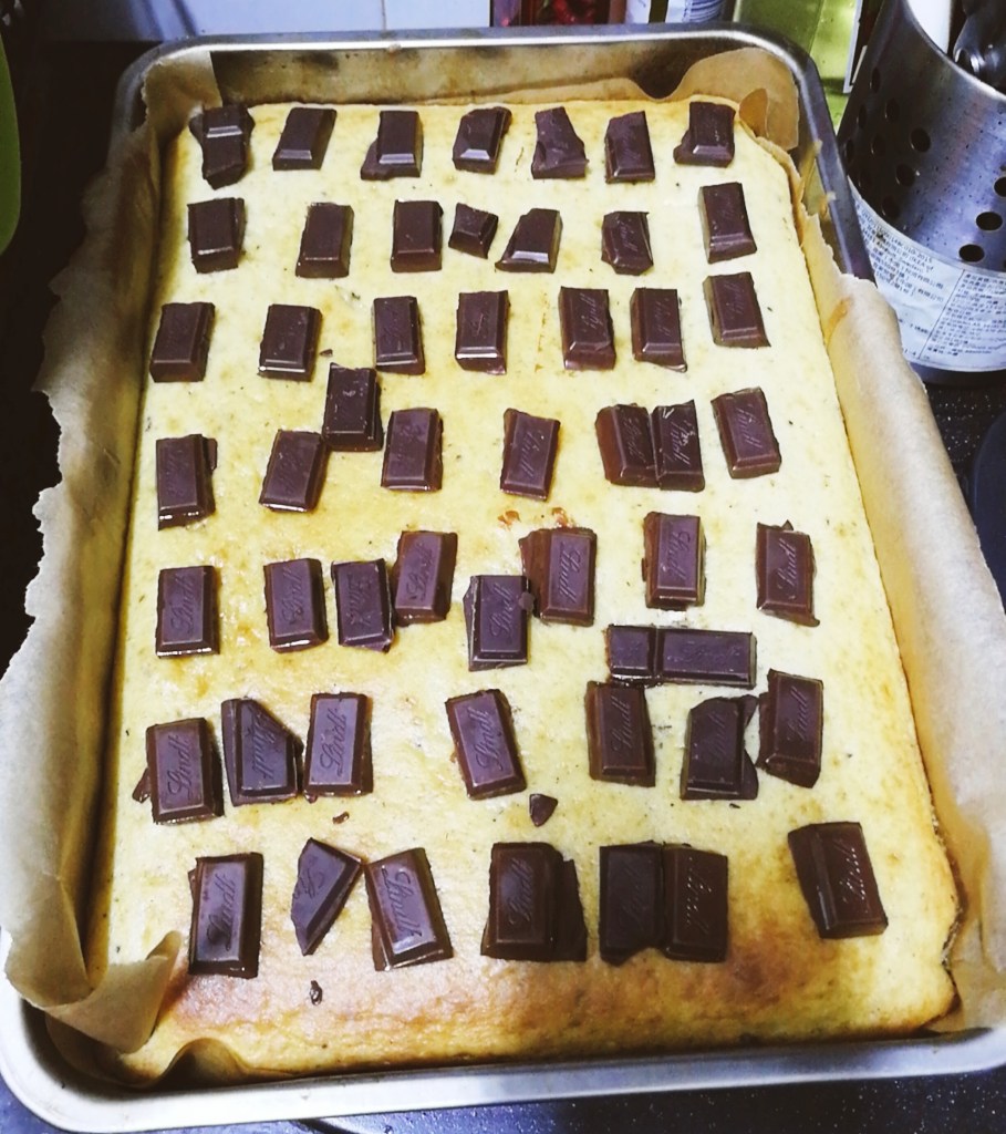 - Remove the cake from the oven, and place the chocolate evenly over the top of the cake. Return to the oven for 3 – 5 minutes for the chocolate to melt. Remove cake from the oven.