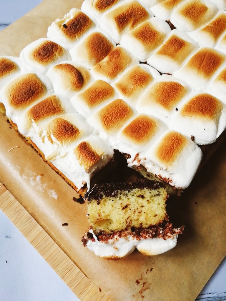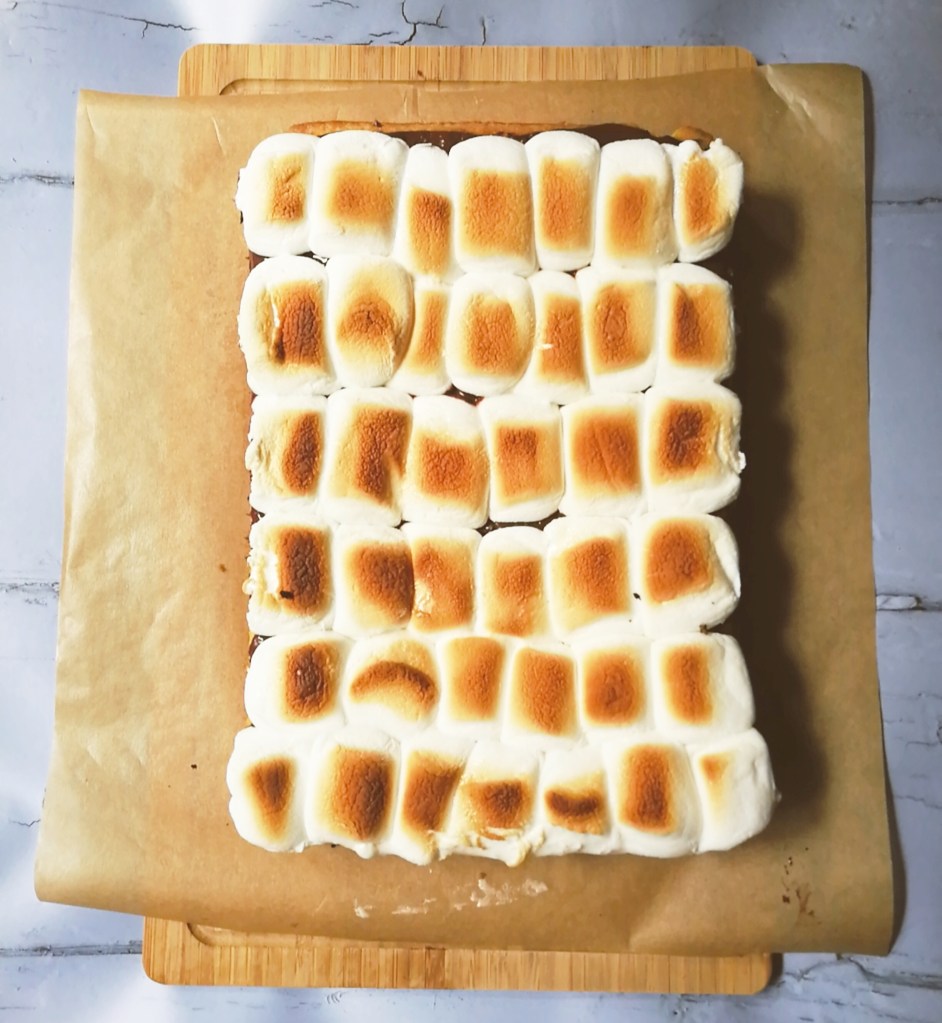 - Place the cake under the grill for approximately 5 minutes, until marshmallows have puffed up and turned golden brown. Remove cake from the oven and allow to cool before slicing and serving.