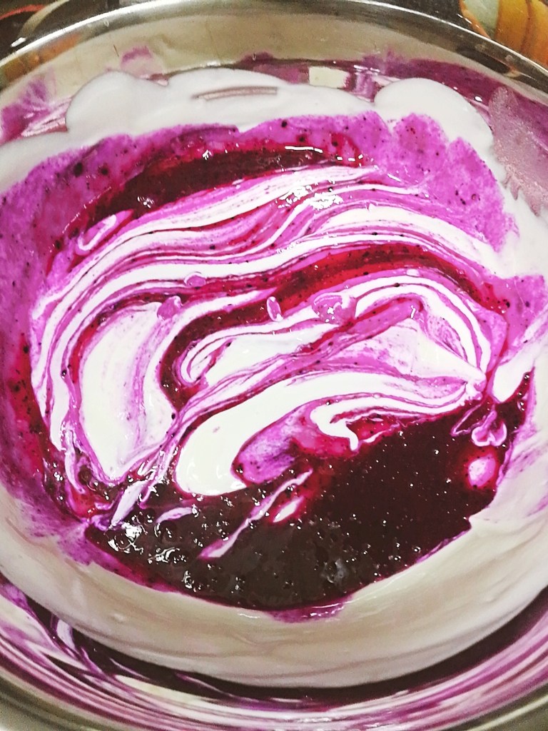 - Pour the dragon fruit puree into the yogurt, and swirl carefully. Try to maintain a yogurt and dragon fruit swirl.