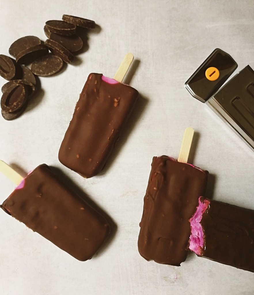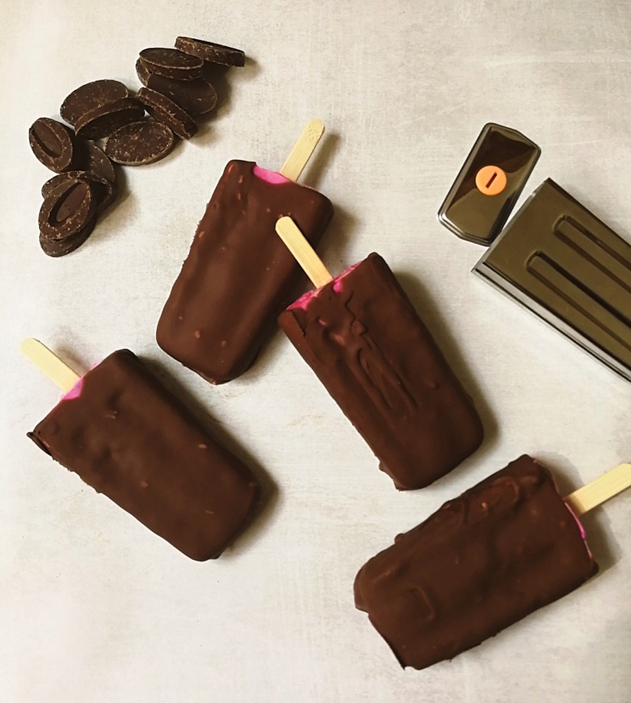- Dip each ice pop into the chocolate and oil mixture, then place back onto the parchment-lined baking tray. Once all ice pops are coated, place them back into the freezer for an hour.